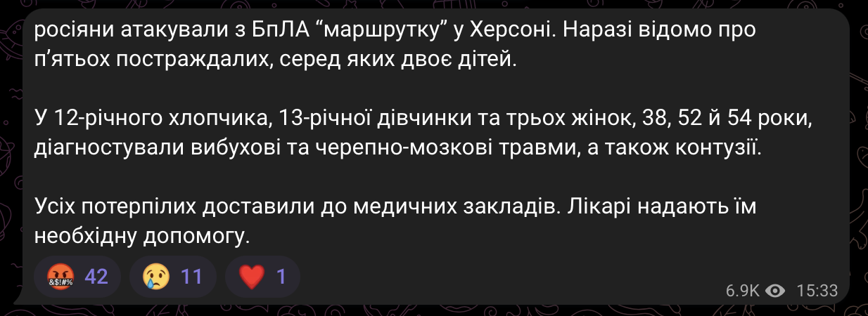 В Херсоне армия РФ применила атаку с беспилотников по маршрутке. Известно о пяти пострадавших, среди которых двое детей.