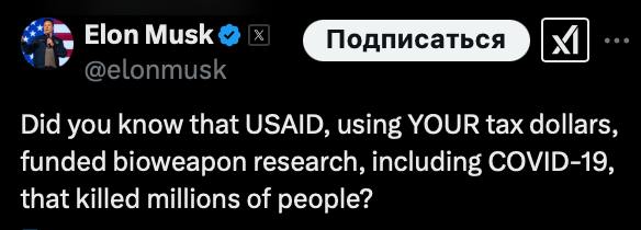 "Знаете ли вы, что USAID, используя ВАШИ налоговые деньги, финансировало исследования биологического оружия, включая COVID-19, в результате которых погибли миллионы людей?" – написал Маск.