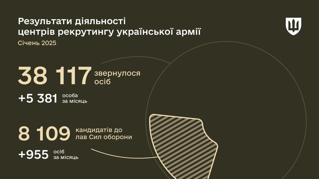 "В январе 2025 года в центры обратились 5 381 человек, что почти на 80% больше среднемесячного показателя прошлого года. В течение января количество кандидатов, начавших процесс вступления в армию, выросло на 955 человек и достигло 8 109 человек", - говорится в сообщении.