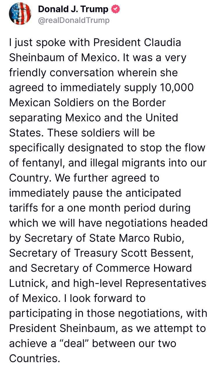 "Только что говорил с президентом Мексики Клаудией Шейнбаум. Это был очень дружелюбный разговор. Она согласилась немедленно направить 10 тысяч мексиканских солдат на границу, разделяющую Мексику и США. Эти солдаты будут специально назначены для того, чтобы остановить поток фентанила и нелегальных мигрантов в нашу страну. Мы согласились немедленно приостановить запланированные пошлины на один месяц, в течение которого состоятся переговоры при участии госсекретаря Марко Рубио, министра финансов Скотта Бессента, министра торговли Говарда Латника и высокопоставленных представителей Мексики. Я с нетерпением жду возможности лично участвовать в этих переговорах с президентом Шейнбаум, чтобы попытаться достичь соглашения между нашими странами", – написал президент США.