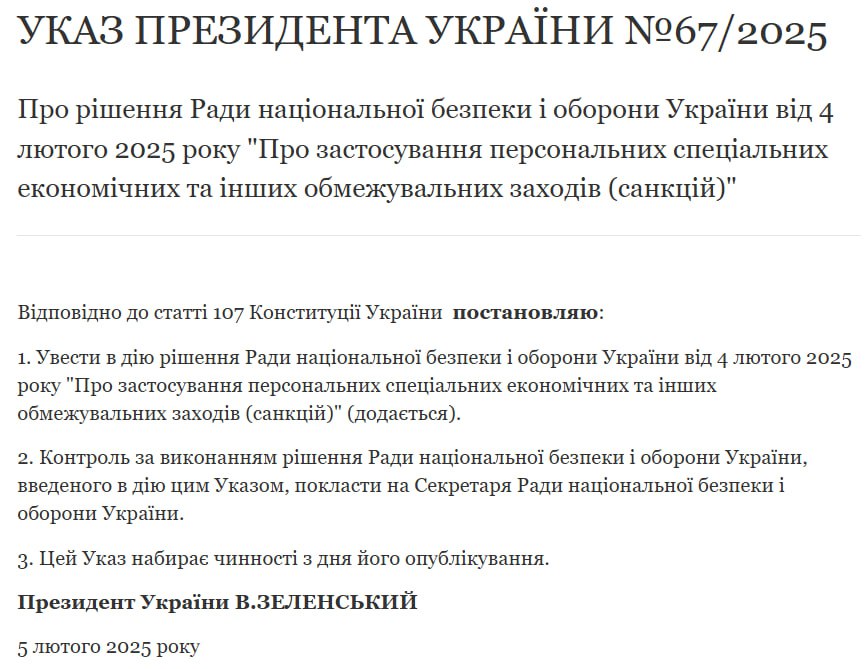 Ранее сообщалось, что в середине января Зеленский подписал указ о введении санкций СНБО "против пропагандистов, работающих на Россию, лиц, перешедших на сторону врага и тех, кто помогает России продолжать войну".