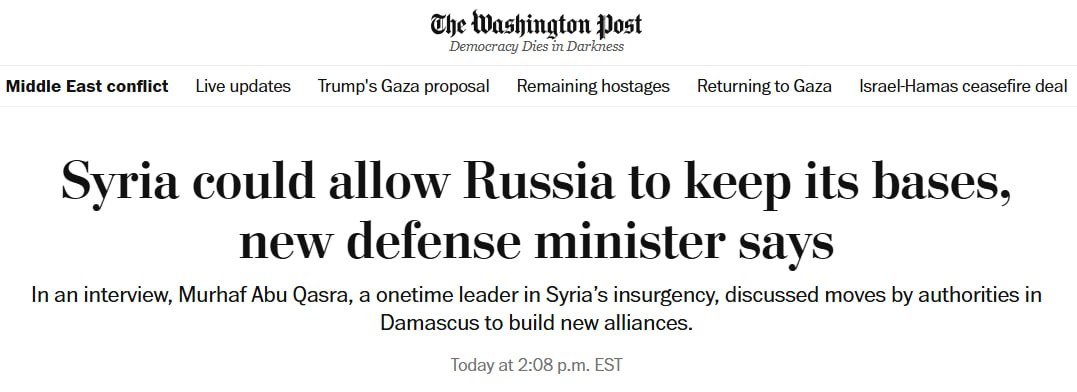 Министр обороны Сирии Мурахф Абу Касра заявил, что Россия может сохранить свои крупные базы в Тартусе и Хмеймиме на побережье Средиземного моря "до тех пор, пока требования Кремля отвечают нашим интересам".