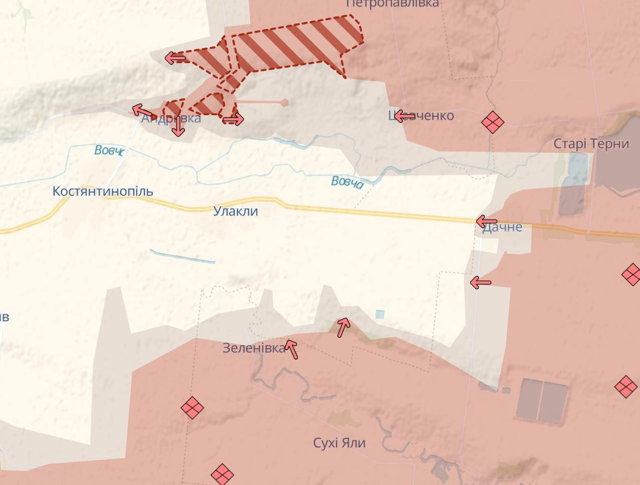 Военный паблик Deep State пишет, что россияне пытаются захватить выступ ВСУ западнее Курахово, чтобы выровнять фронт и перегруппироваться для новых наступлений. Тактической целью РФ является захват населенных пунктов Разлив, Константинополь, Андреевка (где россияне существенно продвинулись и продолжают наращивать активность), Улаклы и Дачное.