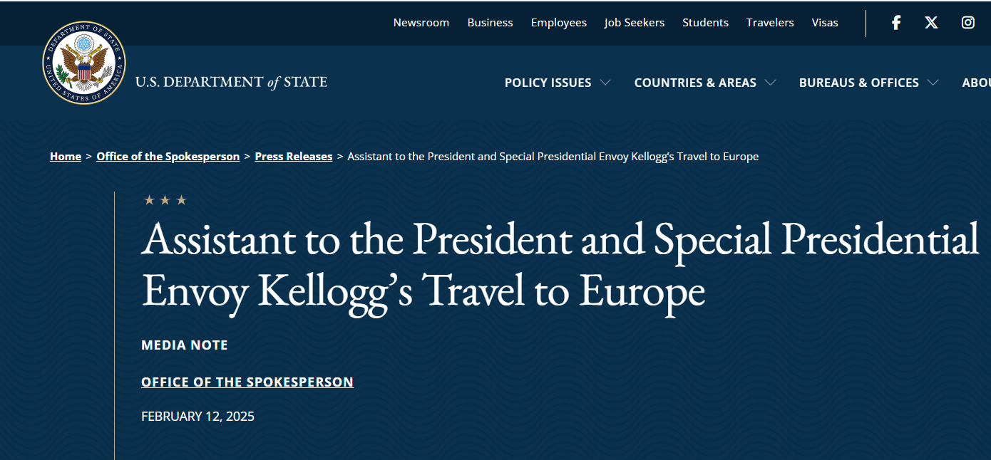 Келлогг примет участие в Мюнхенской конференции по безопасности и посетит штаб-квартиры НАТО и ЕС в Брюсселе, где он будет взаимодействовать с союзниками и партнерами по всей Европе, которые "готовы работать с Соединенными Штатами, чтобы положить конец войне России против Украины и восстановить стабильность в Европе", отмечает Госдеп.