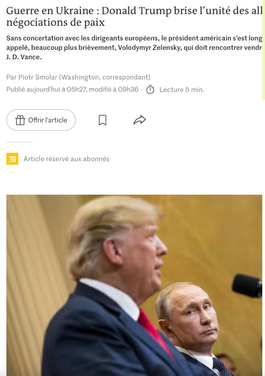 Французская газета Le Monde пишет, что "Трамп нарушает единство союзников, начав мирные переговоры с Путиным". Издание отмечает, что разговор с Зеленским был "более кратким". Также "новый американский президент не предоставляет европейцам никакого места на переговорах".