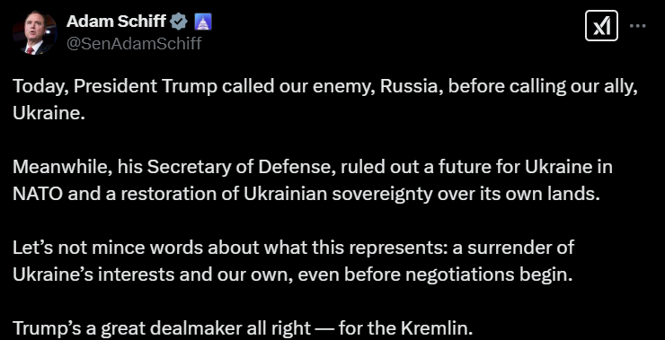 "Президент Трамп позвонил нашему врагу, России, прежде чем позвонить нашему союзнику, Украине... Давайте не будем говорить о том, что это означает: сдачу интересов Украины и наших собственных, еще до начала переговоров. Трамп - прекрасно заключает сделки, особенно - для Кремля", - сказал Шифф.