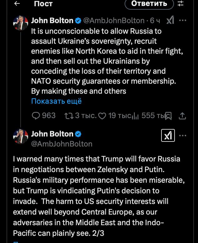 "У меня больше нет никаких ожиданий. Я думаю, мы точно знаем, что произойдет. Президент Трамп фактически сдался Путину еще до начала переговоров. Позиции, которые министр обороны Хегсет объявил в Брюсселе, - я был бы ошеломлен, если бы Трамп не передал их напрямую Путину в их телефонном разговоре, - представляют собой условия урегулирования, которые могли быть написаны в Кремле. Возможно, они были написаны в Кремле и попали по пропагандистским каналам", - заявил Болтон.