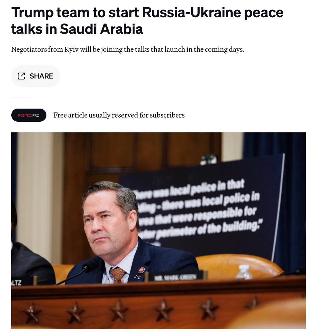 "Высокопоставленные чиновники администрации Трампа направляются в Саудовскую Аравию, чтобы начать мирные переговоры с российскими и украинскими представителями», - пишет издание со ссылкой на республиканского законодателя и двух американских чиновников.