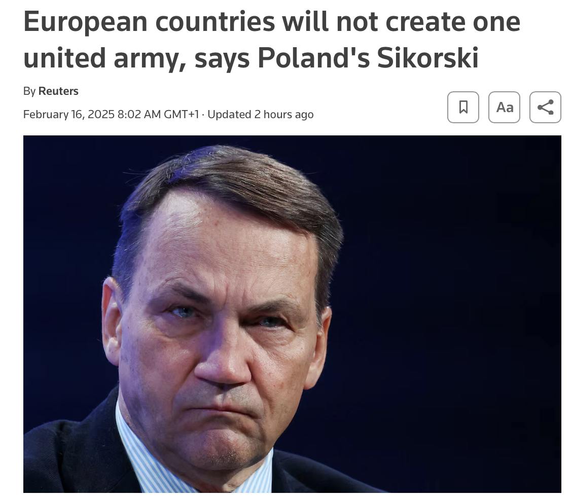 "Мы должны быть осторожны с этим термином, потому что люди понимают разные вещи. Если вы понимаете под этим объединение национальных армий, то этого не произойдет. Но я был сторонником того, чтобы Европа, Европейский союз, развивал свой собственный оборонный потенциал", - сказал польский дипломат.