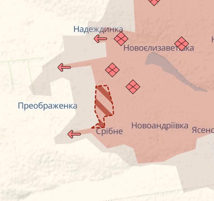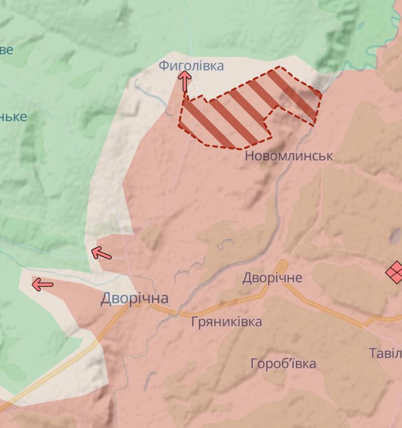 Также россияне продолжают продвижение западнее Великой Новоселки, захватили Срибное в Покровском районе Донецкой области и расширили плацдарм на правом берегу реки Оскол в Харьковской области в районе Новомлынска.