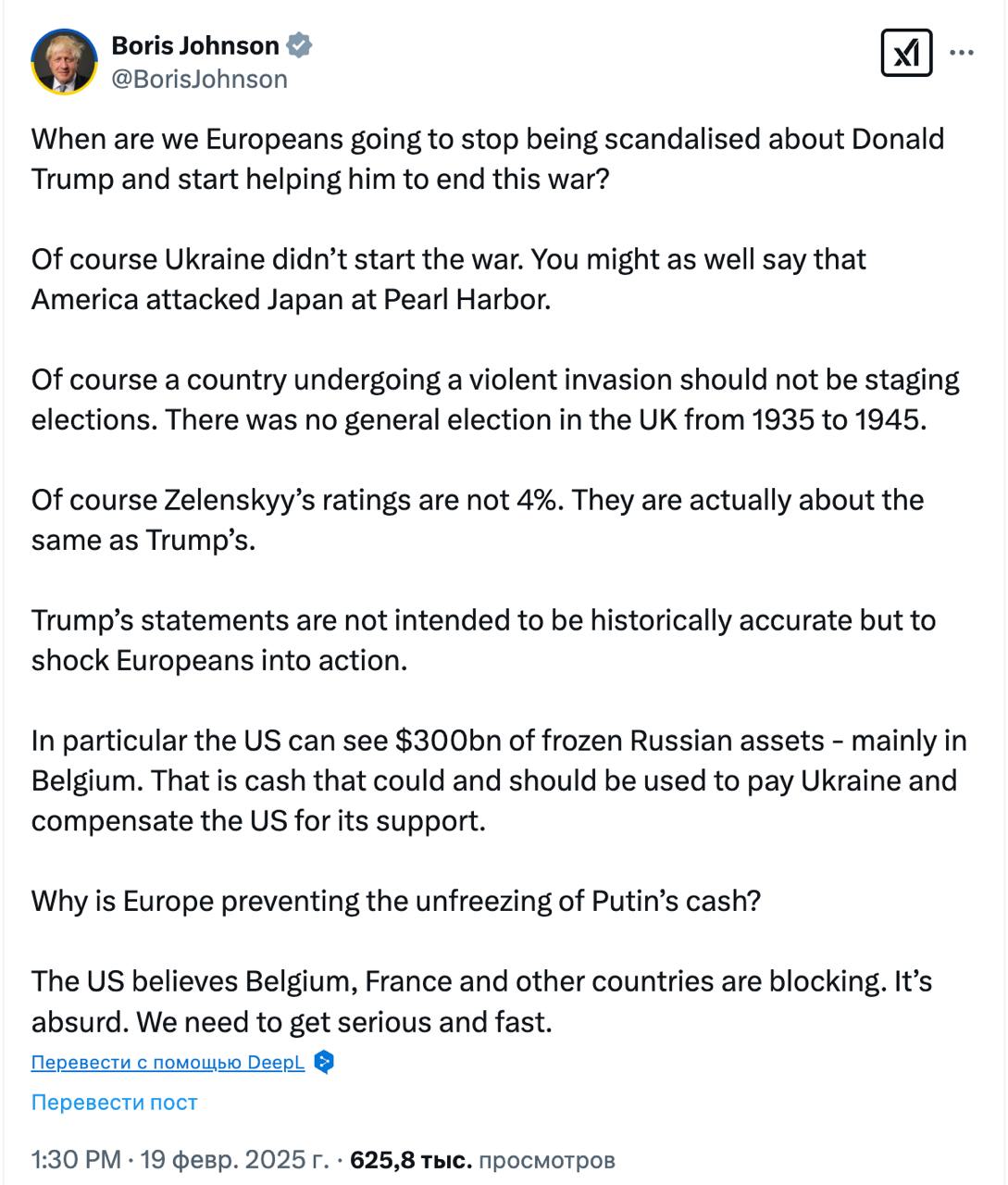 "Когда мы, европейцы, перестанем возмущаться Дональдом Трампом и начнем помогать ему закончить эту войну? Конечно, Украина не начала войну. Можно также сказать, что Америка напала на Японию в Перл-Харборе. Конечно, страна, подвергшаяся насильственному вторжению, не должна устраивать выборы. В Великобритании с 1935 по 1945 год не было всеобщих выборов. Конечно, рейтинг Зеленского не 4%. На самом деле он примерно такой же, как у Трампа. Заявления Трампа не претендуют на историческую точность, а на то, чтобы шокировать европейцев и заставить их действовать. В частности, США могут увидеть 300 млрд долларов замороженных российских активов — в основном в Бельгии. Это деньги, которые можно и нужно использовать для выплат Украине и компенсации США за их поддержку. Почему Европа препятствует размораживанию денег Путина? США считают, что Бельгия, Франция и другие страны блокируют. Это абсурд. Нам нужно стать серьезными и быстрыми", - призвал Джонсон.