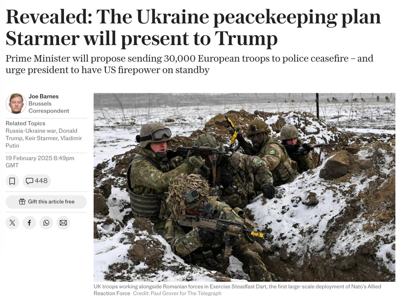 Лондон и Париж предложат президенту США Дональду Трампу разместить свои войска в Украине не на линии фронта, а в городах и на ключевых объектах. А также сосредоточить более крупные силы в сопредельных с Украиной странах НАТО, которые вмешаются в случае новой войны. При этом план предусматривает обязательство США вступить в войну в случае нового вторжения России.