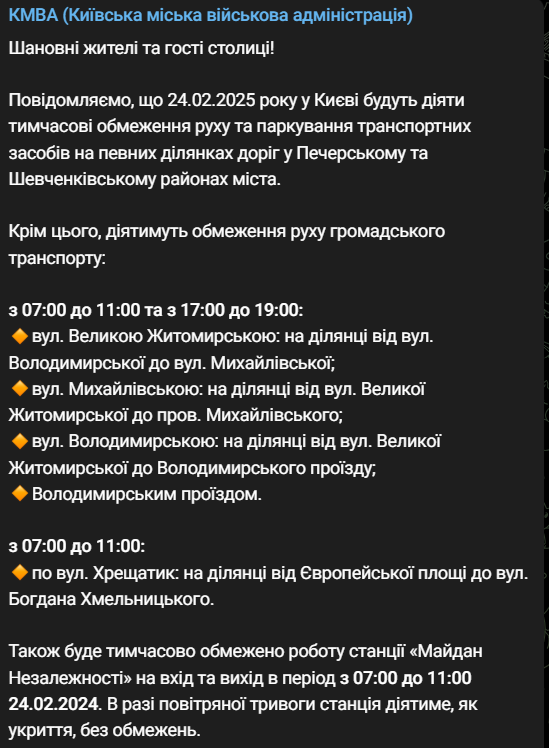 Также будет временно ограничена работа станции "Майдан Незалежности" на вход и выход в период с 07:00 до 11:00 24.02.2024.