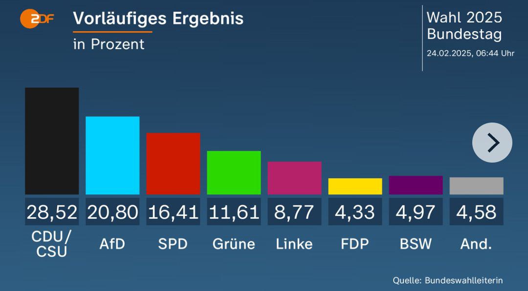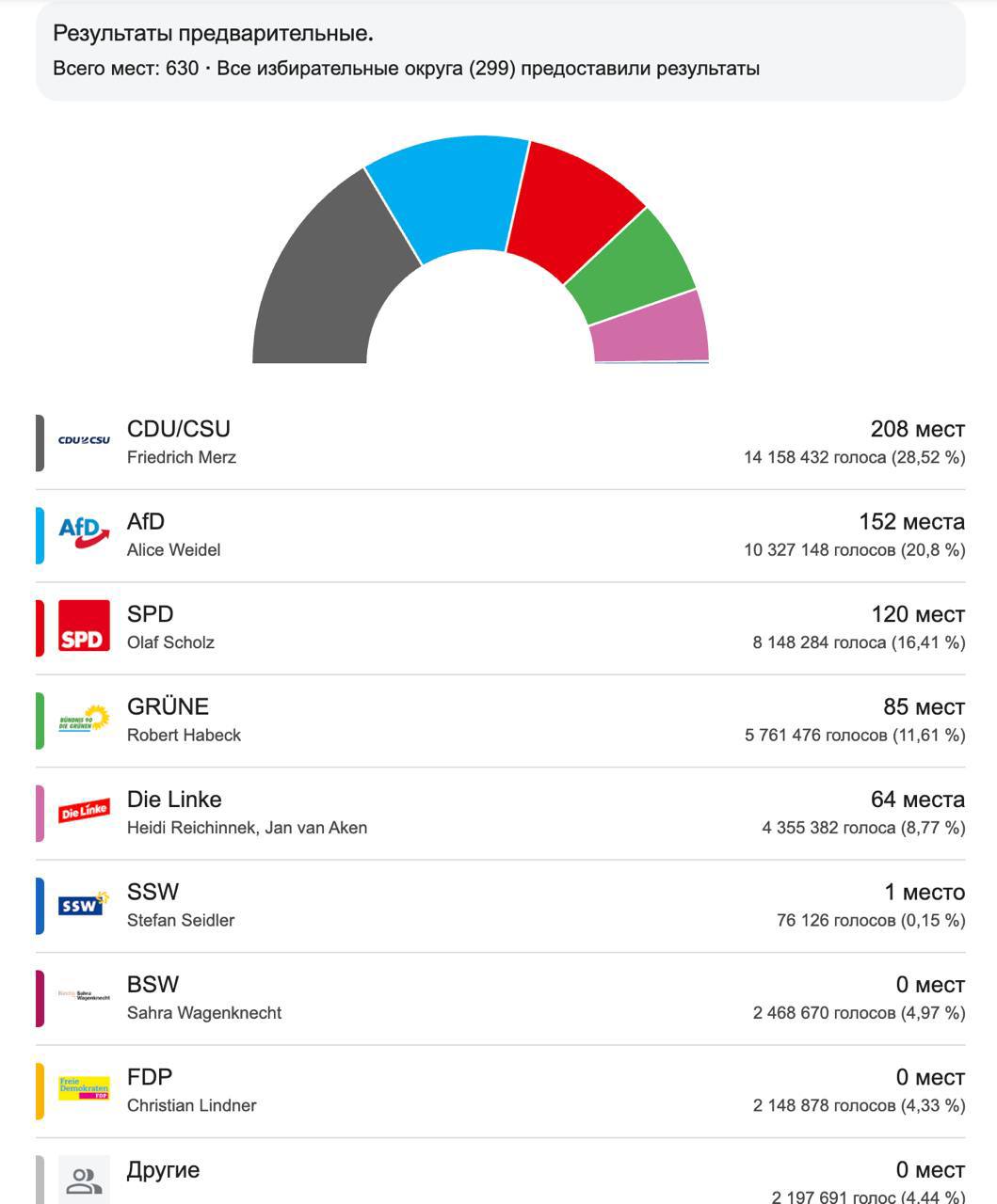 Вчера в ФРГ прошли парламентские выборы. На них одерживает победу блок ХДС/ХСС Фридриха Мерца - 28,52%. На втором месте правая "Альтернатива для Германии" - 20,8%. У нее самый большой прирост по сравнению с прошлыми выборами - 10,4%.