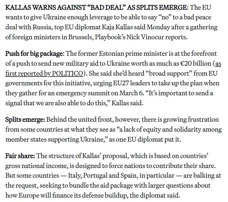 Также Politico отмечает, что Франция с Германией затягивают с ответом на предложение еврокомиссара Каи Каллас о выделении Украине самого крупного за время войны пакета помощи.