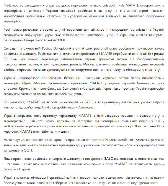 "Украина направила ноту протеста руководству МАГАТЭ, в которой осуждает нарушение суверенитета и территориальной целостности нашего государства и предостерегает от повторения каких-либо подобных действий в будущем", - говорится в заявлении.