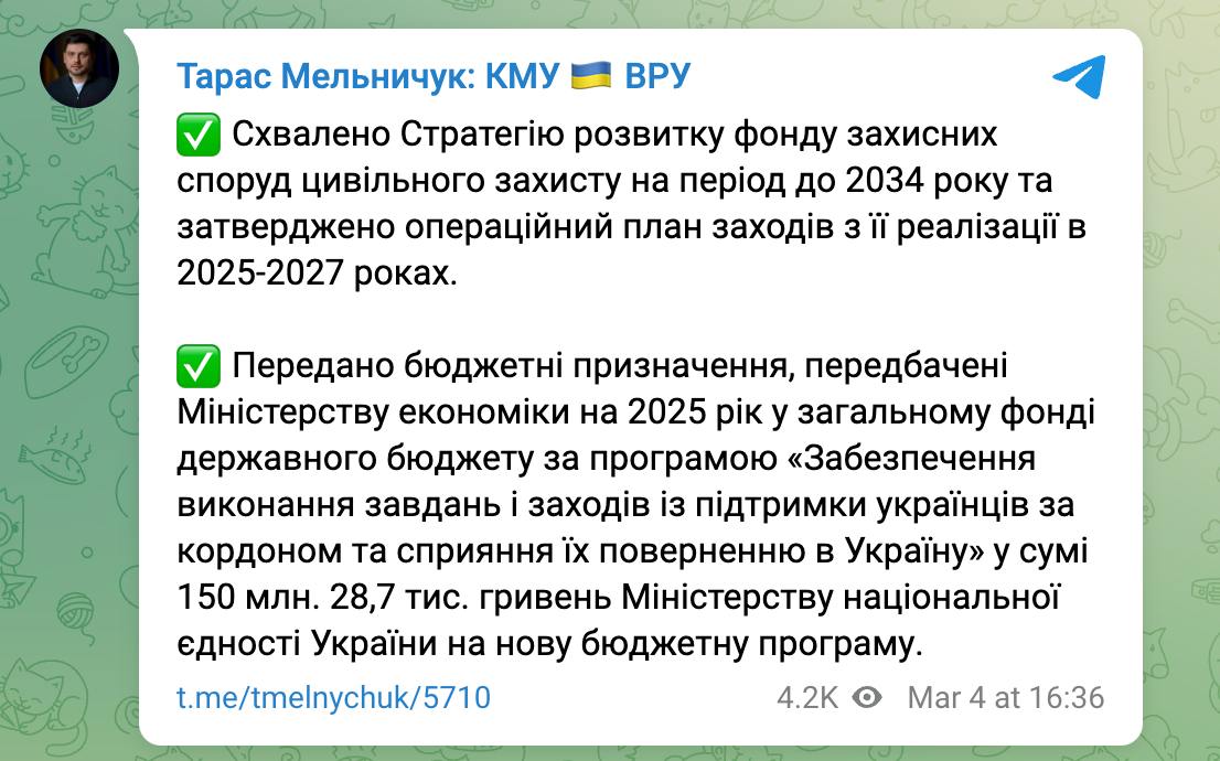 "Переданы бюджетные назначения, предусмотренные для Министерства экономики на 2025 год в общем фонде государственного бюджета по программе "Обеспечение выполнения задач и мероприятий по поддержке украинцев за границей и содействие их возвращению в Украину" в сумме 150 млн 28,7 тыс. гривен Министерству национального единства Украины в новую бюджетную программу", - написал Мельничук.