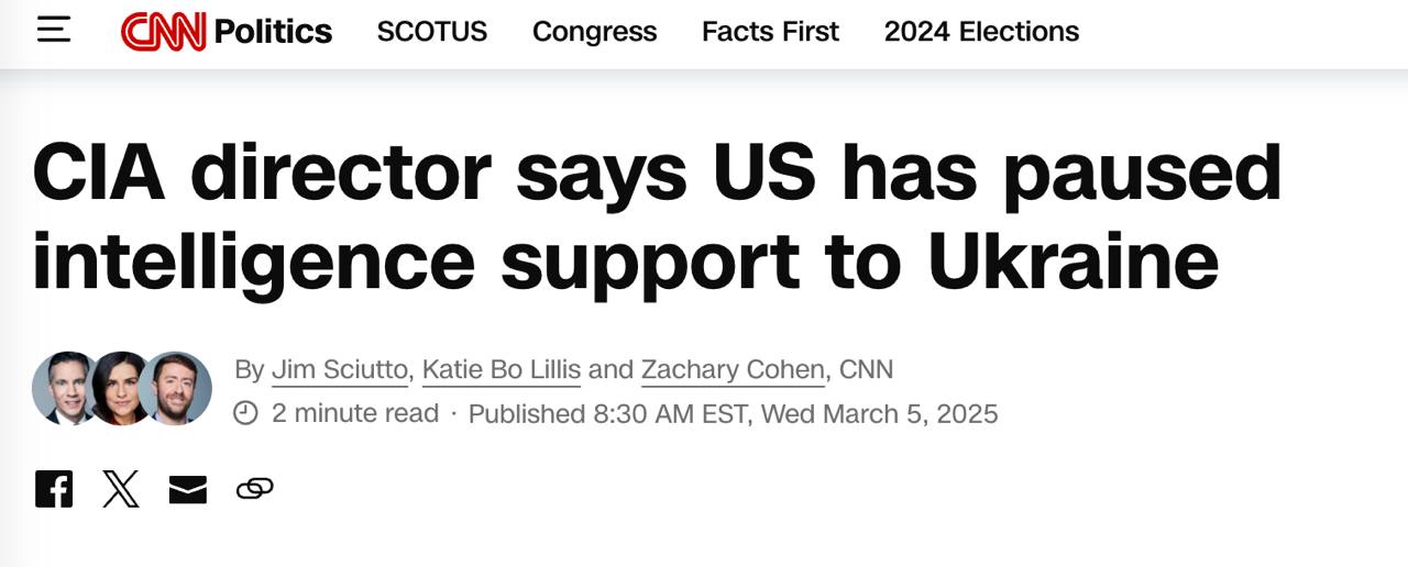В свою очередь британская газета Financial Times со ссылкой на источники тоже написала, что США прекратили обмен разведданными с Украиной вместе с прекращением прочей военной помощи.