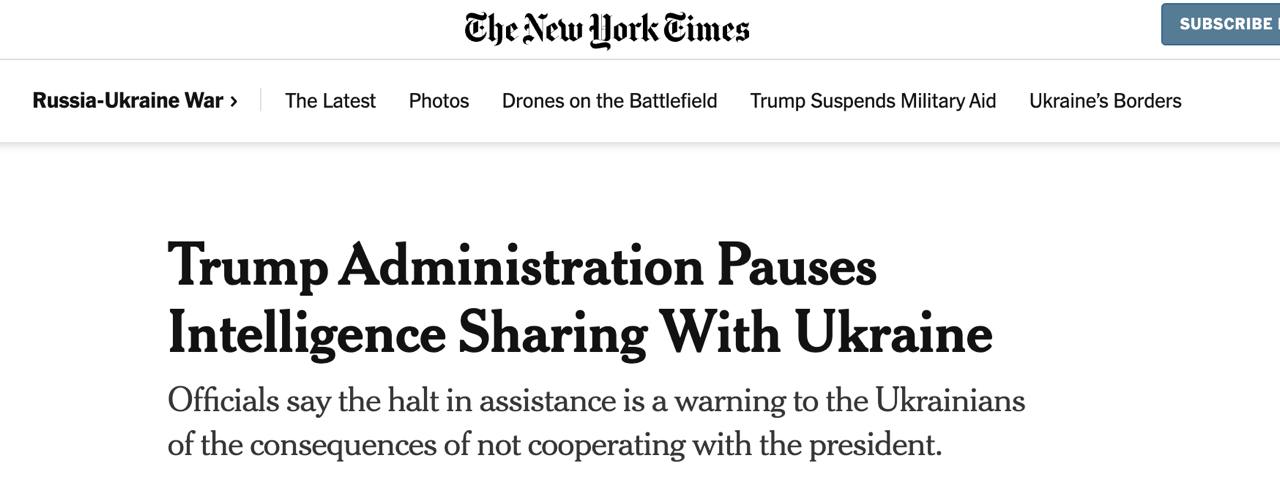США остановили поставки оружия и предоставление разведданных Киеву с целью склонить президента Владимира Зеленского к мирному процессу, а также побудить его уволить украинских чиновников, которых Белый дом "считает враждебно настроенными" к переговорам с РФ, сообщает NYT со ссылкой на высокопоставленного источника в Белом доме.
