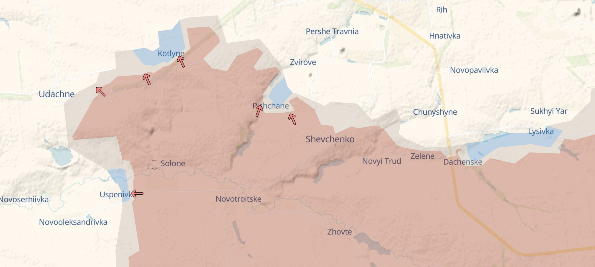 На Покровском направлении пошли в контратаки ВСУ. Они смогли продвинутся в районе Успеновки, Котлино, Песчаного и Шевченково (отмечены на карте голубым цветом).