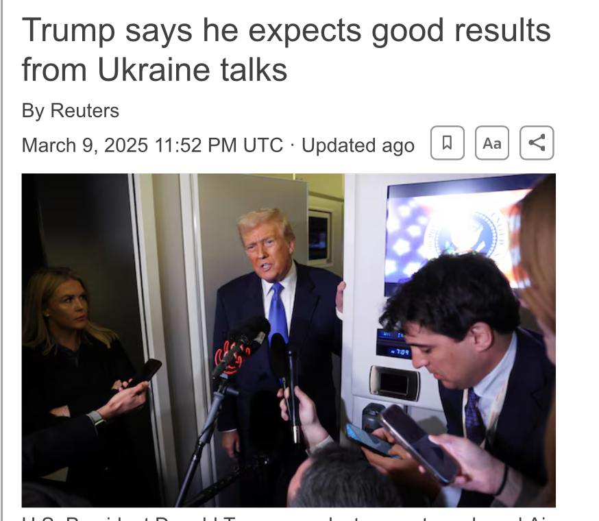 Трамп также сообщил, что ожидает хороших результатов от переговоров США с Украиной в Саудовской Аравии. "Думаю, на этой неделе мы добьемся значительного прогресса", - добавил он.