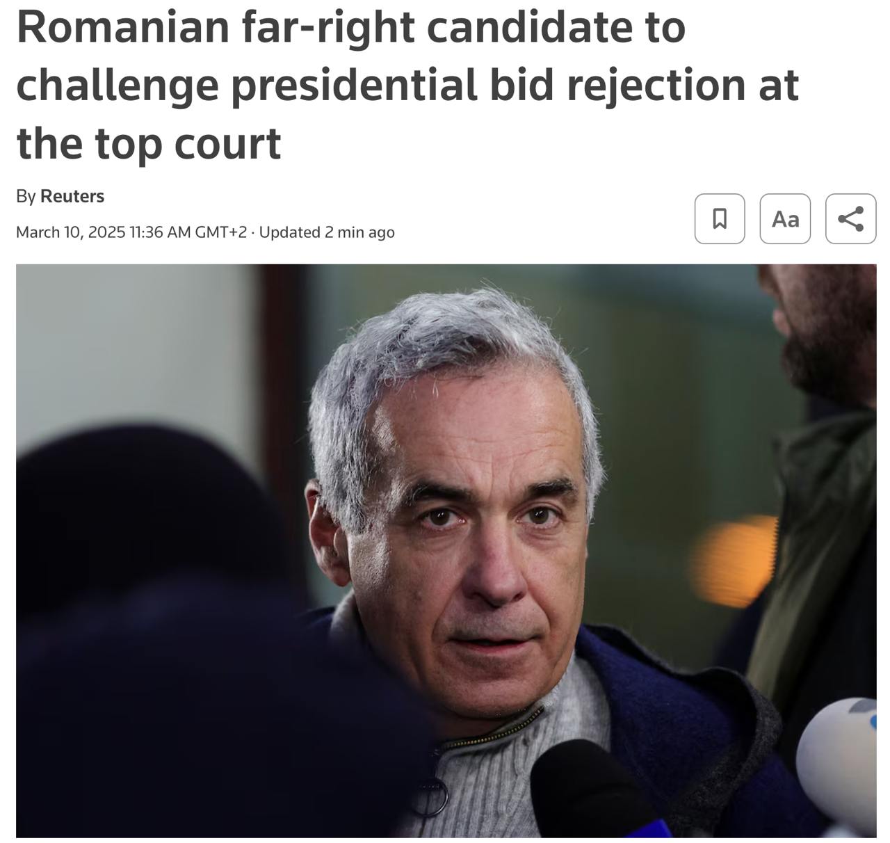 Джордже Симион, лидер оппозиционного Альянса за объединение румын, второй по величине партии в парламенте Румынии, заявил, что "не исключает никаких вариантов", когда его спросили о возможности баллотироваться вместо Джорджеску.