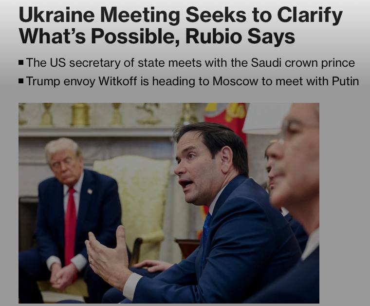 "Мы не собираемся сидеть в комнате и рисовать линии на карте, а просто получим общее представление о том, какие уступки они (украинцы - Ред.) в принципе готовы рассматривать и что им потребуется взамен. А затем выясним, какова позиция России в этом отношении. Это даст нам довольно хорошее понимание того, насколько далеки наши позиции друг от друга", - сказал Рубио накануне вылета в Джидду, где сегодня состоятся переговоры с Украиной.