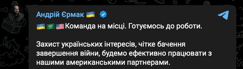 "Команда на месте. Готовимся к работе. Защита украинских интересов, ясное видение завершения войны, будем эффективно работать с нашими американскими партнерами", - написал глава Офиса президента в своем телеграм-канале.