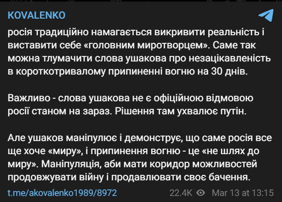 "россия традиционно пытается искривить реальность и выставить себя "главным миротворцем". Именно так можно толковать слова ушакова о незаинтересованности в кратковременном прекращении огня на 30 дней.
