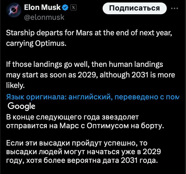 "В конце следующего года звездолет отправится на Марс с Оптимусом на борту. Если эти высадки пройдут успешно, то высадки людей могут начаться уже в 2029 году, хотя более вероятна дата 2031 года", - написал бизнесмен.