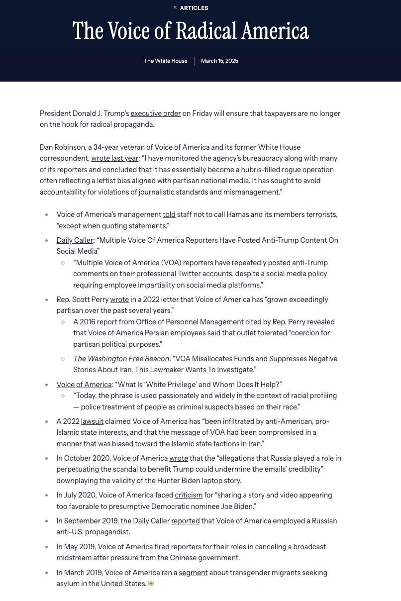 Напомним, вчера Трамп подписал указ о значительном сокращении масштабов деятельности американского правительственного "Агентства по глобальным средствам массовой информации" и некоторых других правительственных структур.