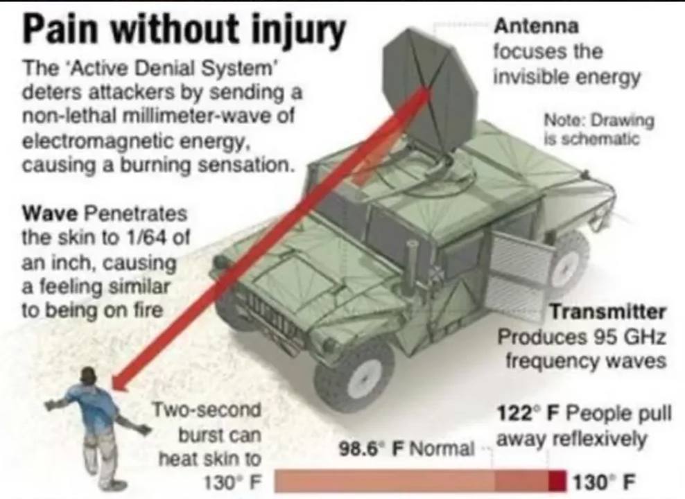 Система "активного отталкивания" испускает несмертельные миллиметровые волны электромагнитной энергии, которые вызывают ощущение жжения. Волна проникает в кожу на глубину 0,04 сантиметра, создавая чувство, будто человек находится в огне.