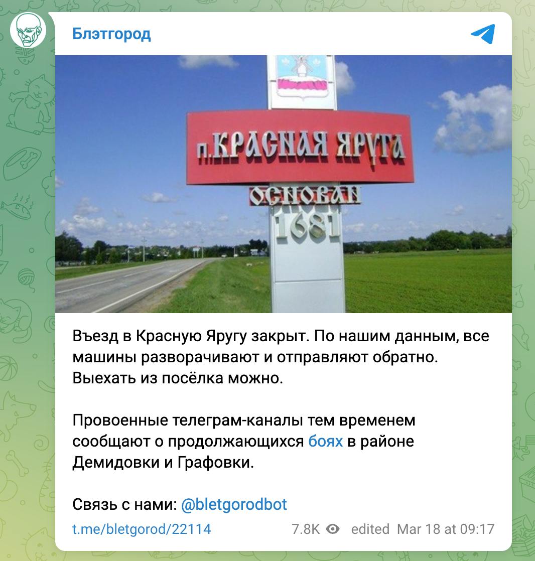 Также в Белгородской области РФ закрыли въезд в Красную Яругу, сообщают местные каналы. Этот поселок находится в Краснояружском районе, где, как сообщается, идут бои.