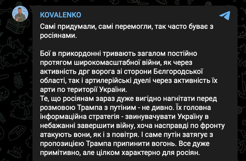 "Сами придумали, сами победили. Бои в пограничных продолжаются в целом постоянно в течение широкомасштабной войны, как из-за активности ДРГ врага со стороны Белгородской области, так и артиллерийские дуэли из-за активности их арты по территории Украины", - написал глава "Центра по борьбе с дезинформацией" Андрей Коваленко.