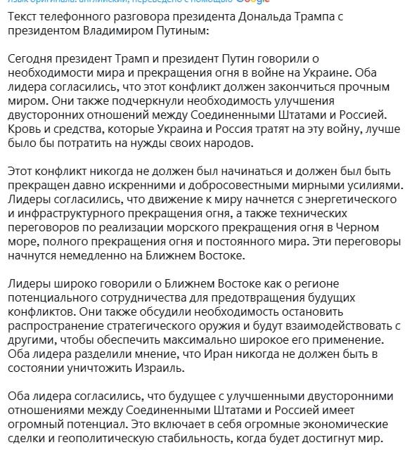"Сегодня президент Трамп и президент Путин обсудили необходимость мира и прекращения огня в войне в Украине. Оба лидера согласились с тем, что этот конфликт должен закончиться прочным миром. Они также подчеркнули необходимость улучшения двусторонних отношений между США и Россией. Кровь и ресурсы, которые Украина и Россия тратят на эту войну, лучше направить на нужды их народов.
