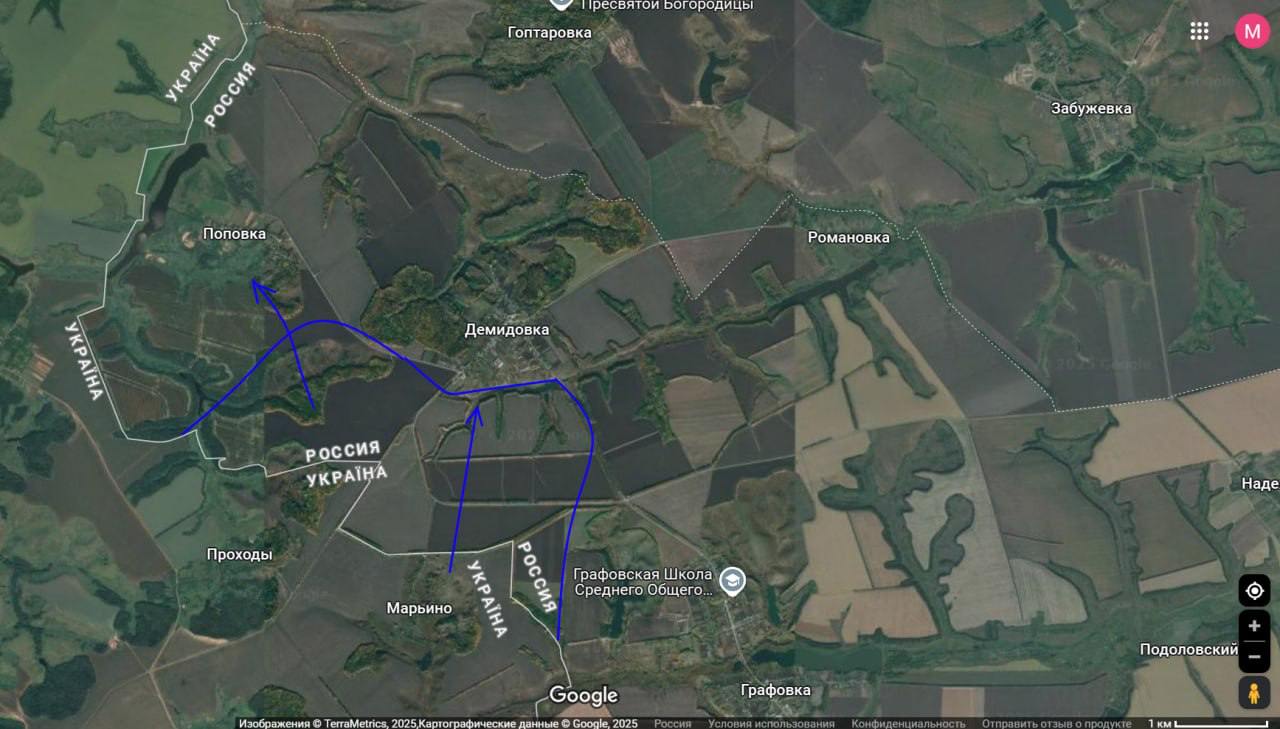 Тем временем российские паблики пишут, что украинские части находятся в южной части села Демидовка и пытаются прорваться дальше. Также продолжаются бои за село Поповка, которое практически разрушено.