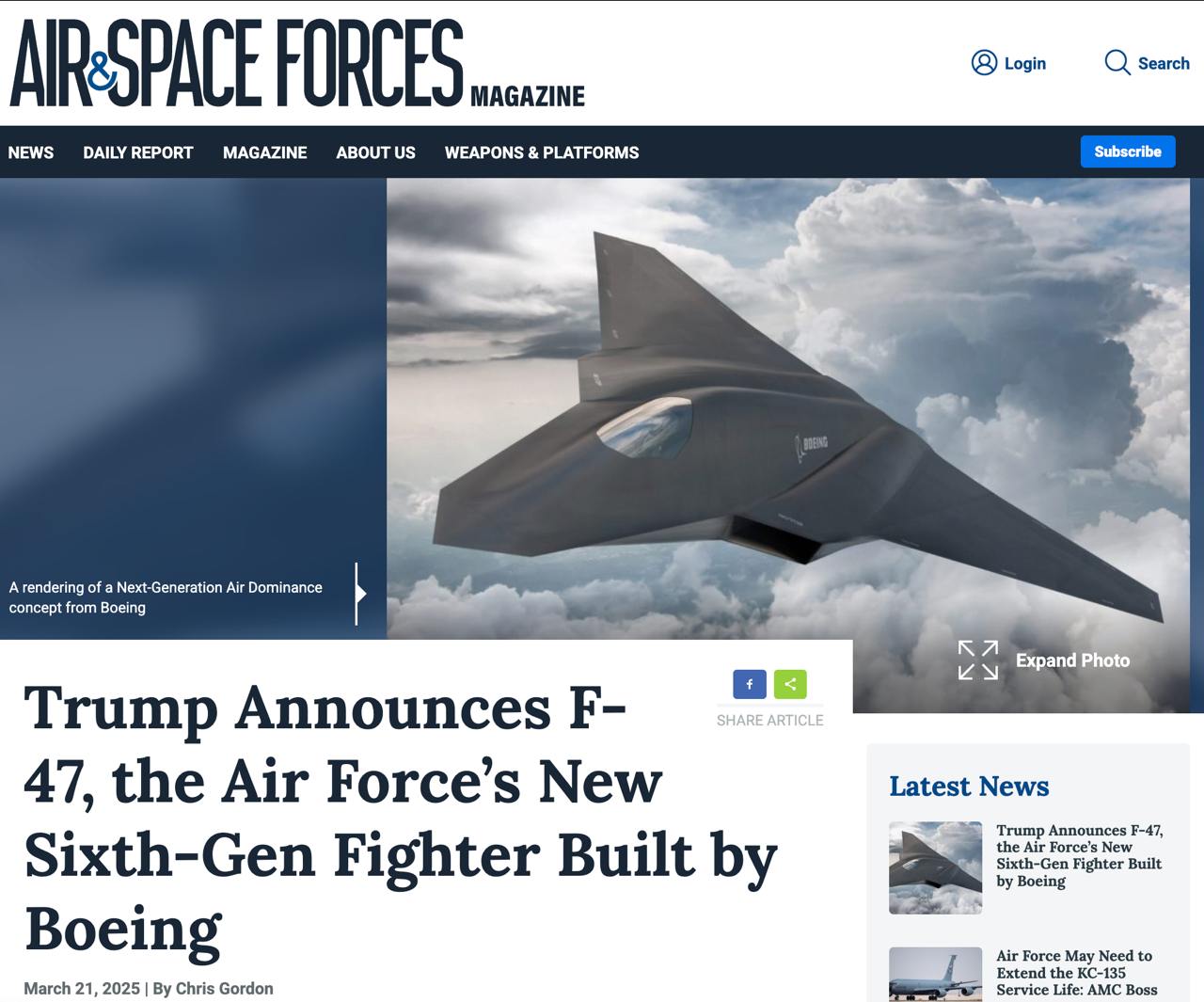 Трамп объявил, что Boeing выиграл у Lockheed Martin конкурс на разработку пилотируемого истребителя шестого поколения, который получит наименование F-47. Это решение месяцами откладывали из-за бюджетных ограничений и смены приоритетов.