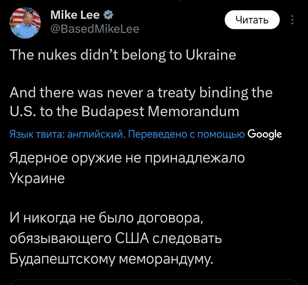 "Ядерное оружие не принадлежало Украине. И никогда не было договора, обязывающего США следовать Будапештскому меморандуму", - написал он.
