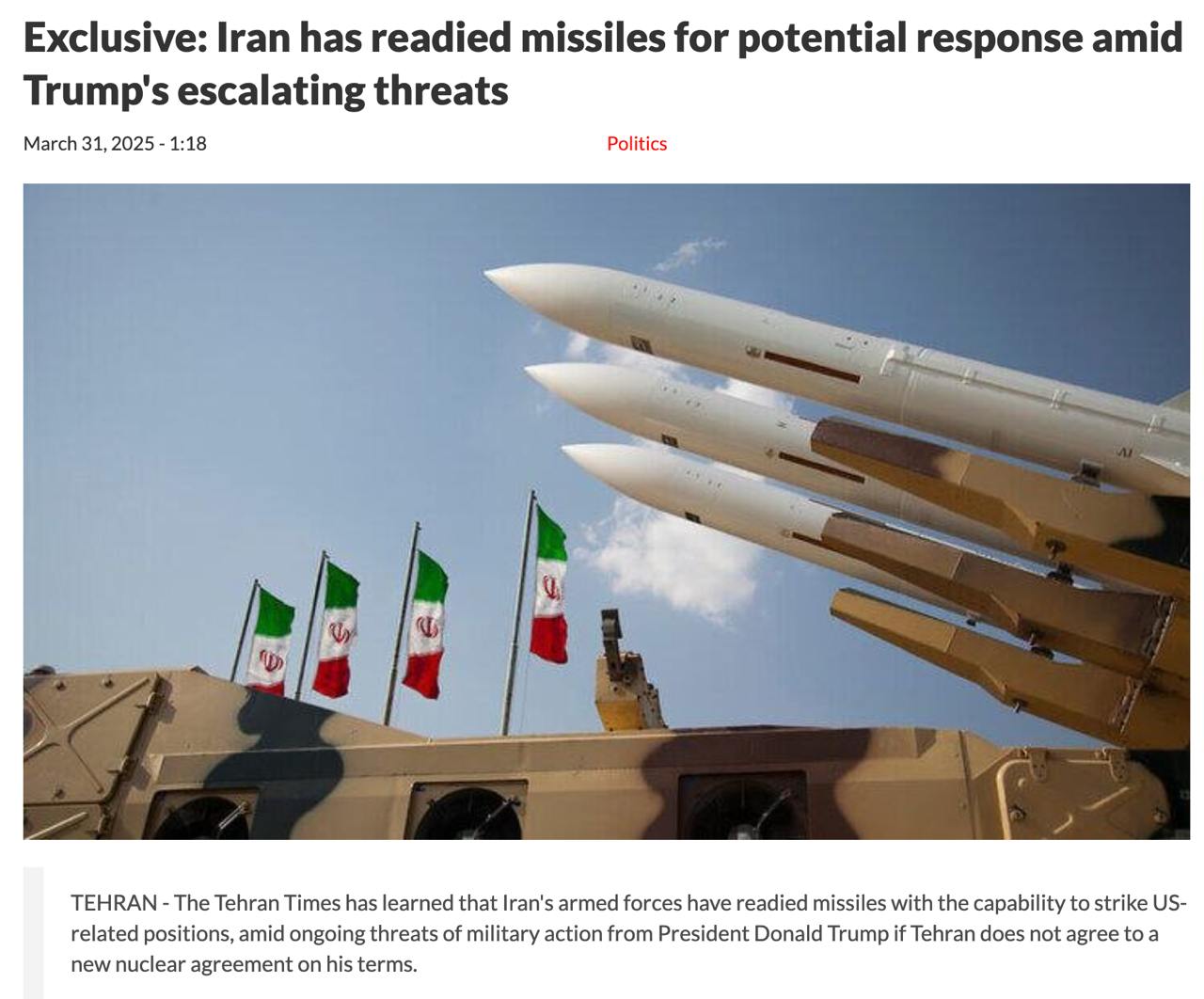 По данным Tehran Times, армия Ирана подготовила ракеты, способные наносить удары по позициям, связанным с США. Причем подземные пусковые установки разбросаны по всей стране, чтобы их было сложнее поразить.