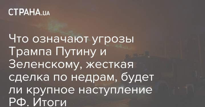 Трамп по-прежнему хочет как можно скорее подойти к прекращению огня. Украинские власти он уже принудил к этому. Теперь пытается договориться с РФ методом "кнута и пряника" (угрозы ужесточить санкции в случае отказа Москвы идти на перемирие и обещания их снять в случае согласия). При этом Трамп ведет и параллельную, но не менее для него важную, линию - установить фактический контроль над процессом послевоенного восстановления Украины через так называемую "сделку по недрам", которая обеспечит американцам первоочередное право на участие в инвестиционных проектах, а также даст право на получение доходов от разработки украинских недр. Так как Зеленский, очевидно, в таком виде не хочет подписывать соглашение, Трамп ему и угрожает "большими проблемами". Возможно, впрочем, помимо "кнута" у Трампа для Зеленского есть и некий "пряник" в виде финансовой и/или политической составляющей в обмен на подписание сделки. Впрочем, если он и есть, то публично о нем не говорят.