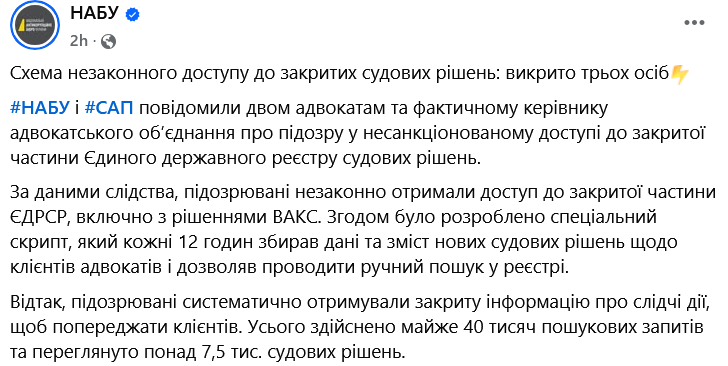 Вскоре после появления сообщений о заявлении Ассоциации, НАБУ на своей странице в Фейсбуке написало, что сообщило двум адвокатам и "фактическому руководителю адвокатского объединения" о подозрении в несанкционированном доступе в закрытую часть Единого госреестра судебных решений.