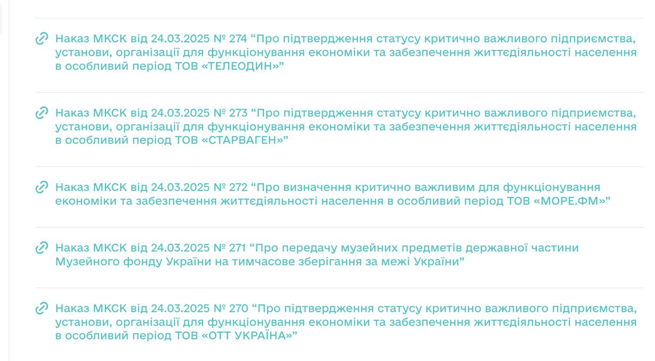 11:32 Минкульт продлил возможность бронировать сотрудников музыкальным телеканалам М1, М2,  Суспильному (НСТУ), криворожскому ТРК "Рудана" и прикарпатскому изданию ПИК.