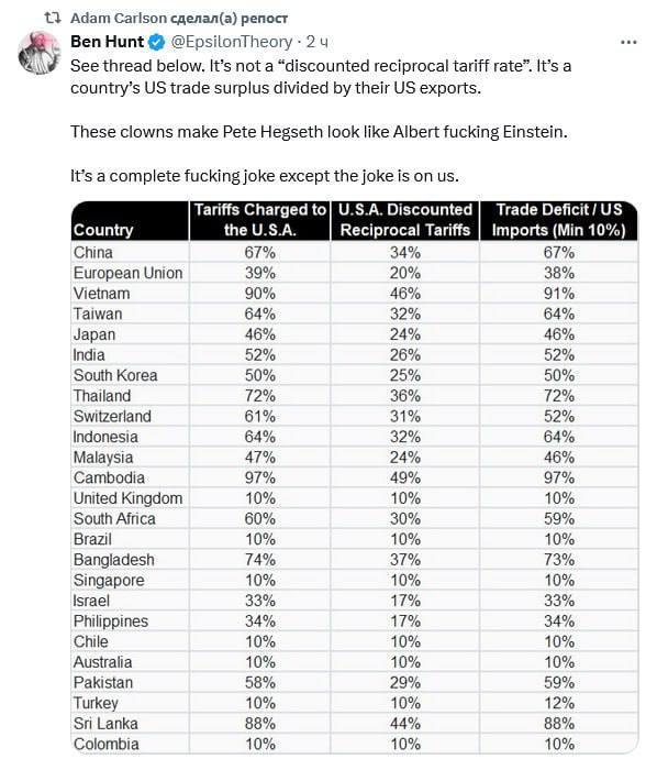 "Это не "дисконтированная взаимная тарифная ставка". Это положительное сальдо торгового баланса страны с США, деленное на ее экспорт в США"», - пишет блогер Ben Hunt. Он также приводит таблицу, где видно, что "тариф против США" равен доле торгового дефицита между Америкой и другими странами.