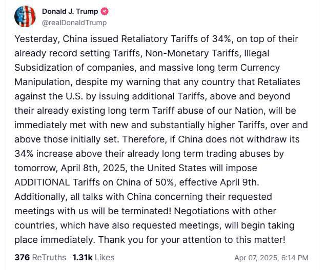 "Если Китай до завтра, 8 апреля 2025 года, не отменяет увеличения на 34% над уже продолжающимися торговыми злоупотреблениями, Соединенные Штаты введут дополнительные тарифы на Китай в размере 50%, начиная с 9 апреля. Кроме того, все переговоры с Китаем по поводу запрашиваемых ими встреч с нами будут прекращены!" – написал президент США.
