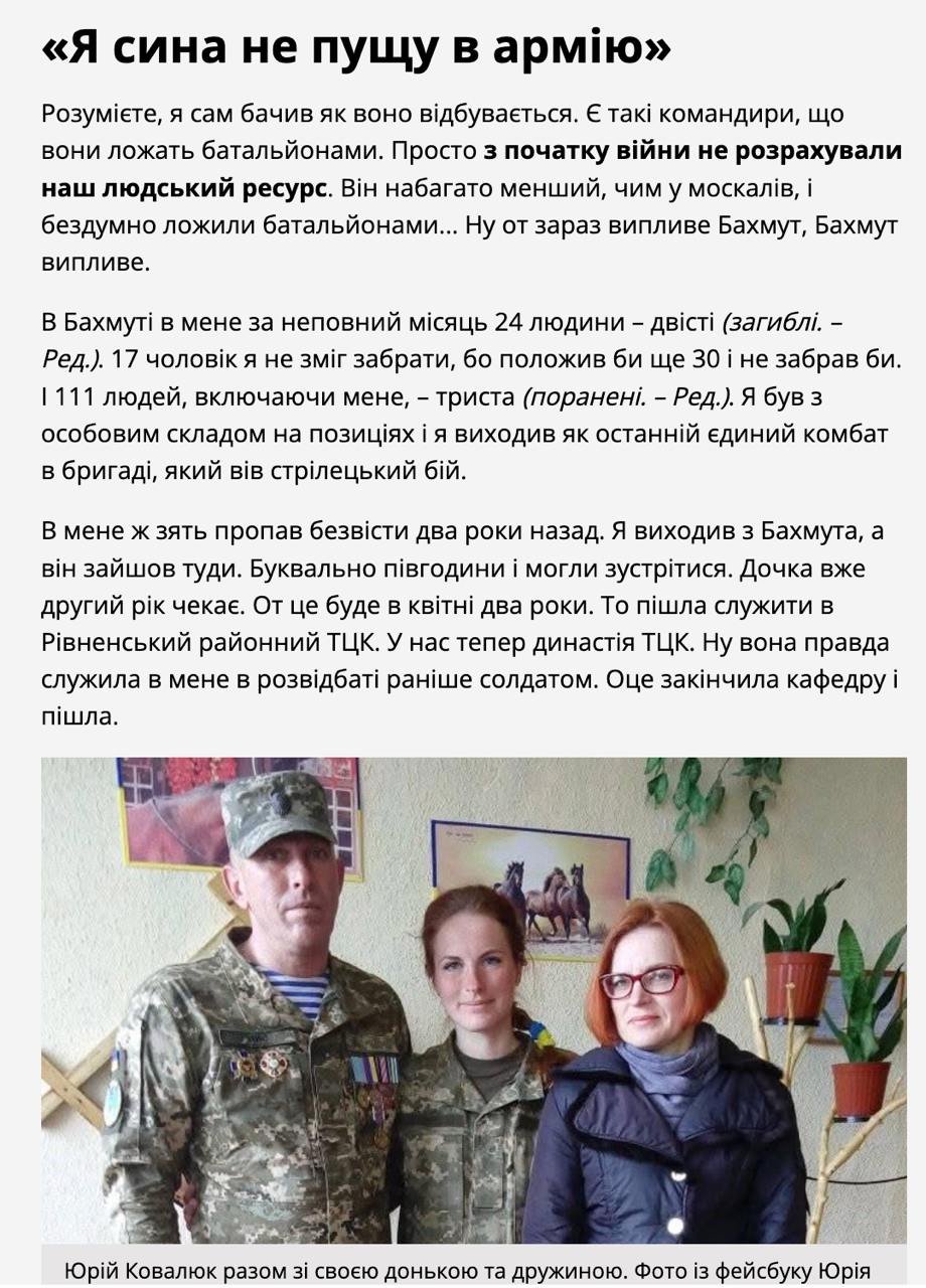 В частности, пропал без вести зять Ковалюка. Его дочь служила солдатом, а сейчас также работает в ТЦК.