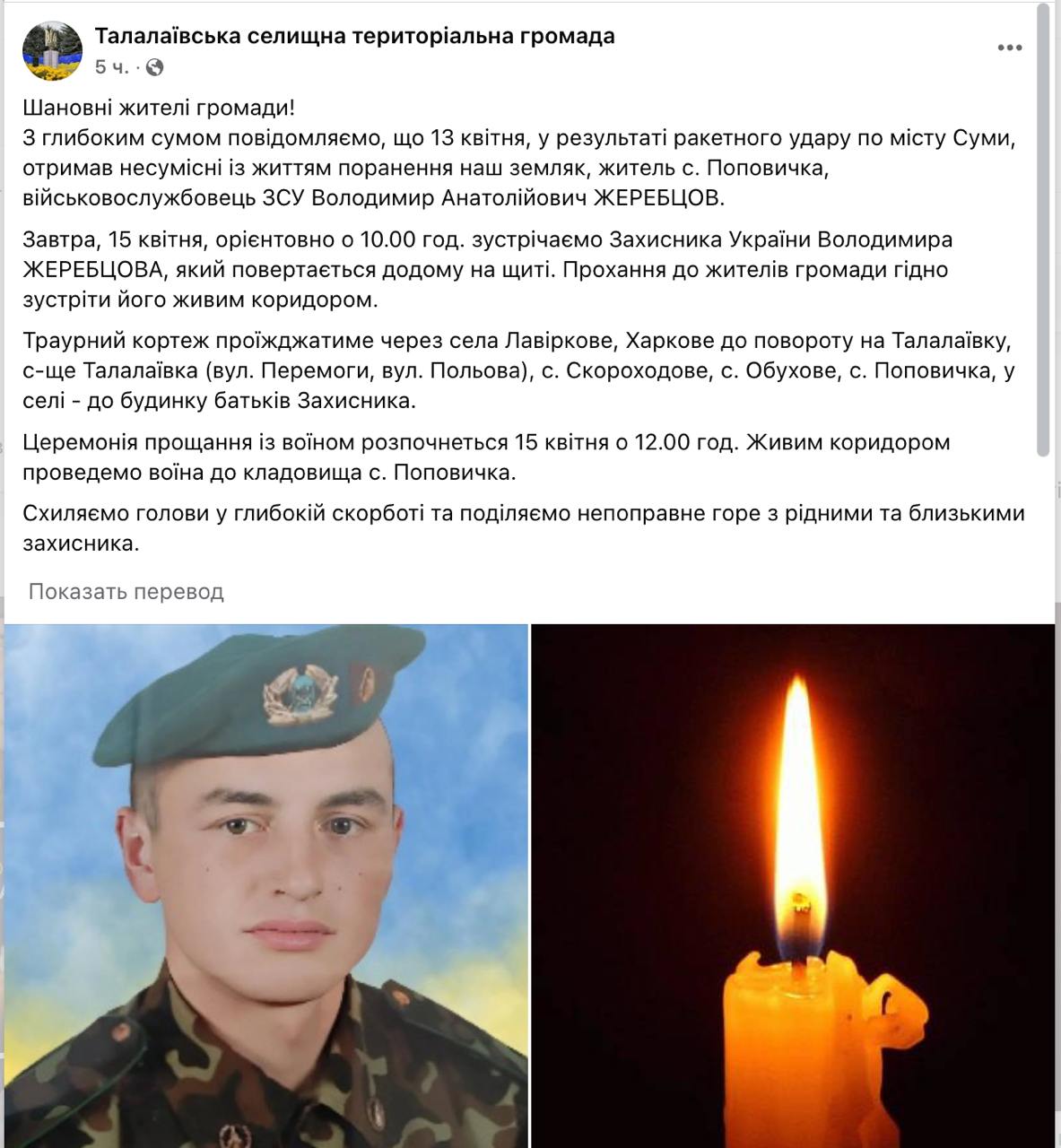 17:50 Появилось сообщение о гибели ещё одного военного в результате вчерашнего ракетного удара по центру Сум.