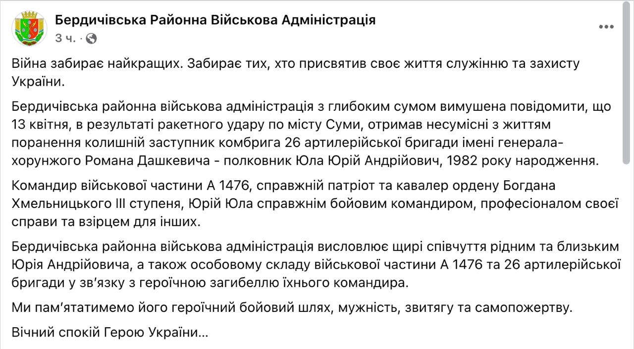 11:36 В Сумах в результате вчерашнего ракетного удара РФ погиб заместитель комбрига 26 артиллерийской бригады полковник Юла Юрий Андреевич.