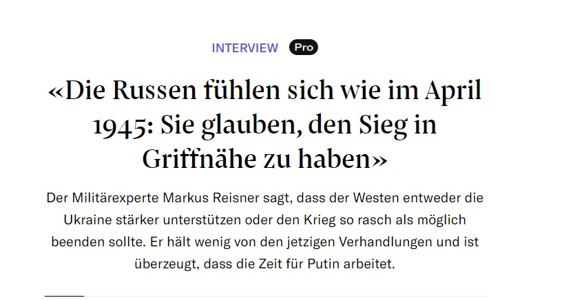 "Примечательно и объявление о рекордном призыве 160 000 человек этой весной. Иначе говоря, россияне чувствуют себя как в апреле 1945 года на Зееловских высотах, глядя на Берлин: они верят, что победа у них в руках", - говорит Райснер.