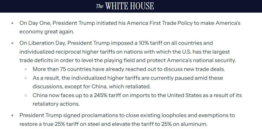 "В результате индивидуальные более высокие пошлины в настоящее время приостановлены на фоне этих обсуждений, за исключением Китая, который принял ответные меры. Теперь Китаю грозит пошлина в размере 245% на импорт в Соединенные Штаты в результате его ответных действий", - говорится в заявлении.