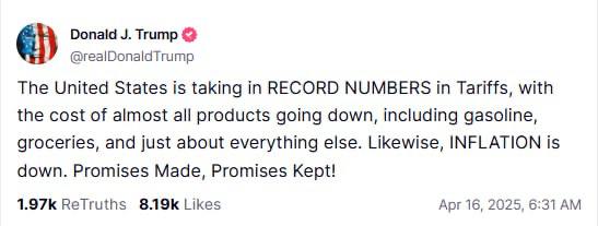 "Соединенные Штаты принимают рекордные поступления от пошлин, при этом стоимость почти всех продуктов снижается, включая бензин, продукты питания и почти все остальное. Аналогично снижается инфляция. Обещания даны, обещания выполнены!" - написал американский лидер на своей странице в социальной сети Truth.